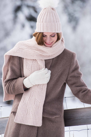 Narsaq består av en klassisk lue i ribbestrikk med oppbrettskant og ett staselig, langt skjerf i en kombinasjon av ribbestrikk og fletter.